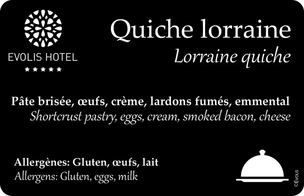 With Edikio Guest, harmonise your buffet labels and food signs to strengthen your establishment’s brand image. Our printing solutions allow you to fully customise your buffet food labels — from the information displayed (dish names, translations, allergens) to their appearance (choice of card material, colour, size). You control every detail to create the perfect food tags for buffet presentation. Each product has its place, and every label becomes a valuable source of information, contributing to your professional and flawless image.