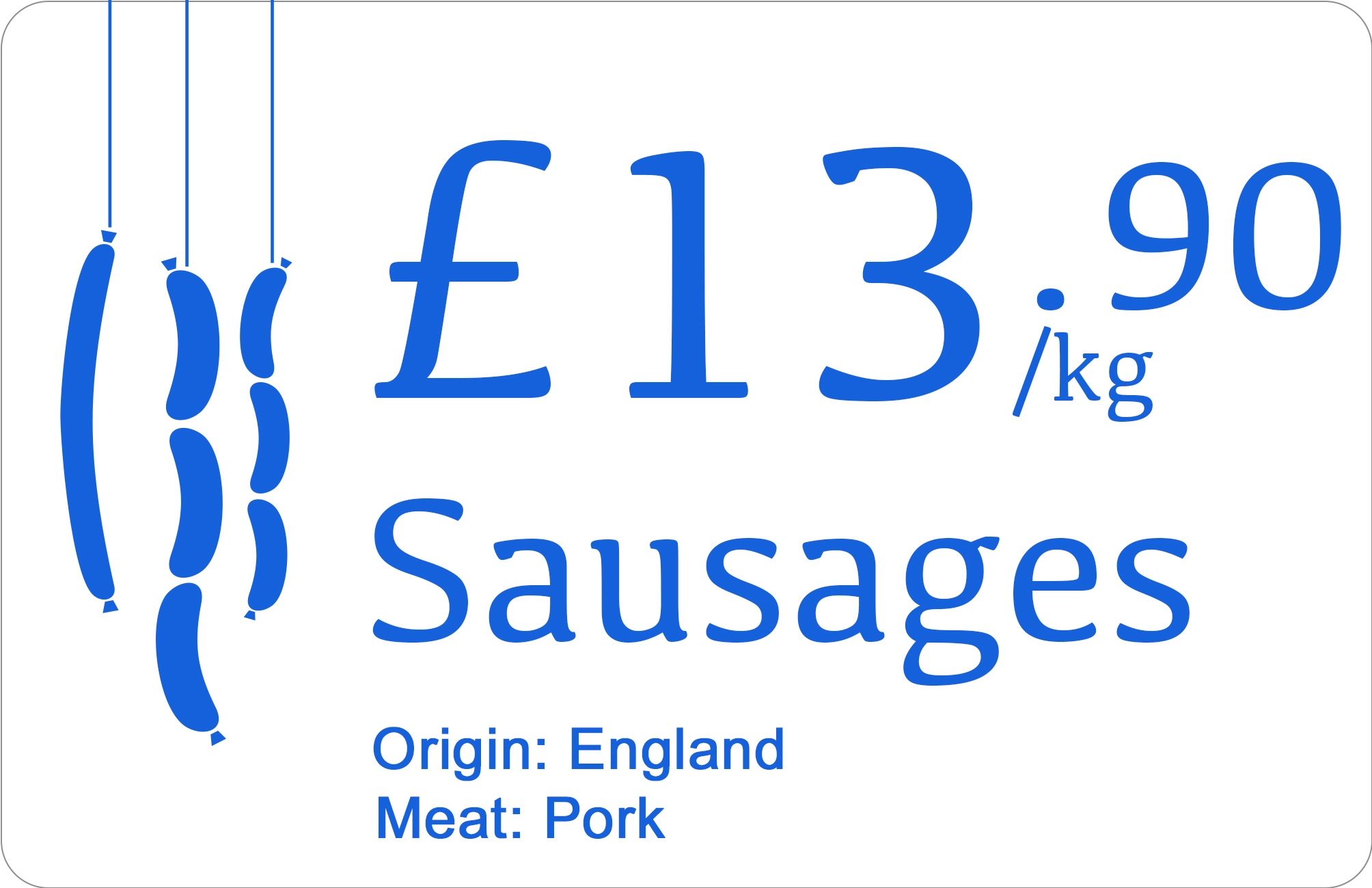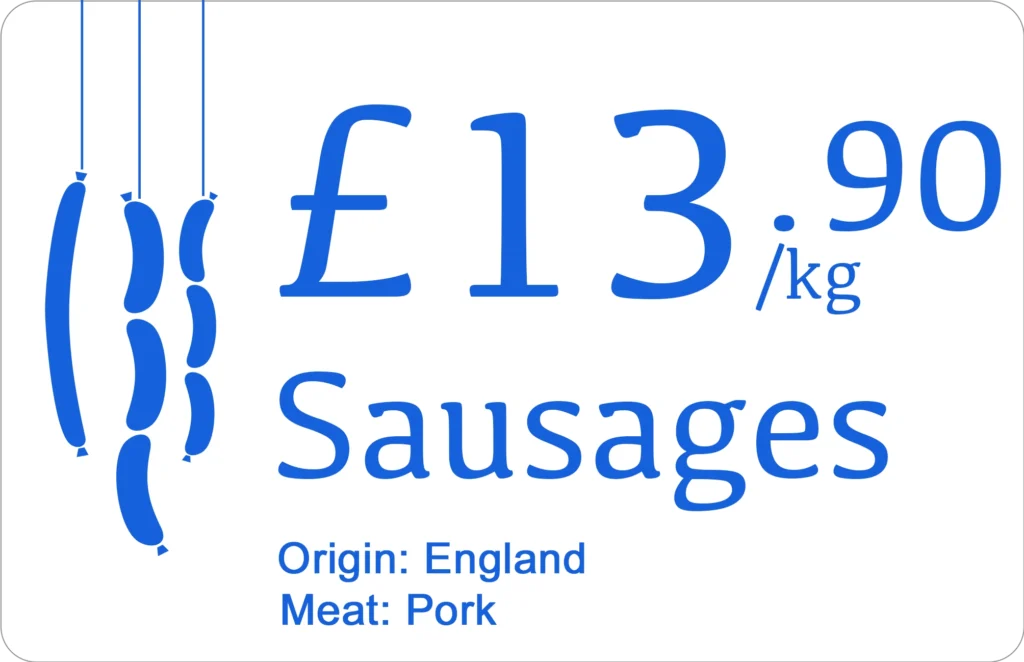 Customise your butcher price labels to include all required regulatory info: price per kilo/unit, product origin, allergens, ingredients (for prepared foods), and more.