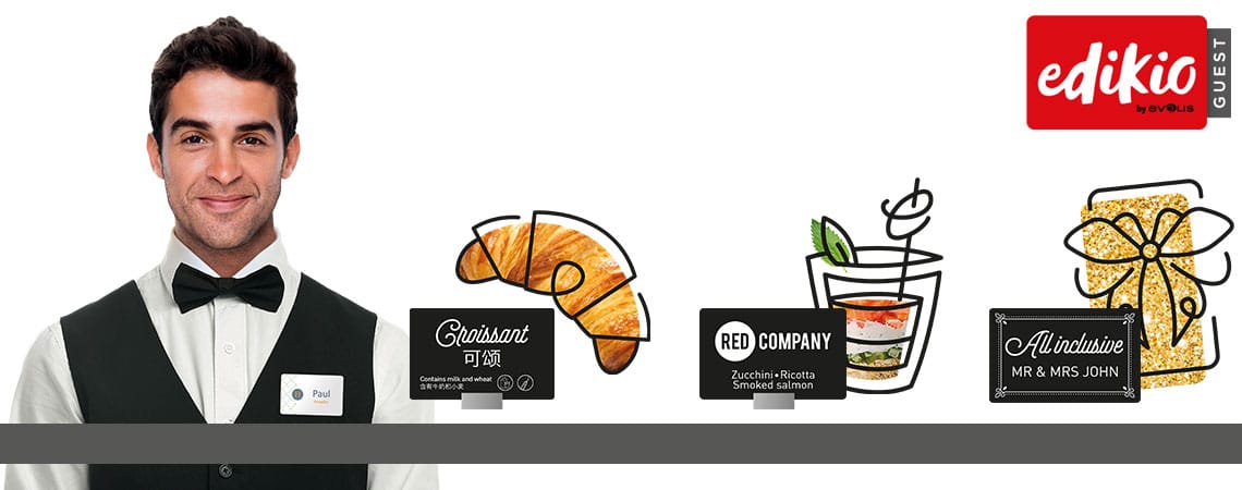 A buffet’s lack of information or aesthetic appeal can damage a hotel’s image. Now it’s easy to make your buffet stand out from the crowd and meet the information needs of a demanding clientele. With Edikio Guest, restaurant managers can create presentation labels on durable, washable cards. They can display all the necessary information, such as the product name, ingredients and allergens, in one or more languages. This innovative, flexible solution will help customers to make quick, informed choices and keep the buffet flowing smoothly.