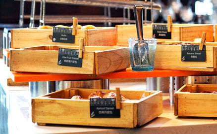 Each label clearly indicates the food category, allergens (represented by small pictograms) and also the names of the dishes in Chinese/English to satisfy both local and international customers. The clarity of the information provided enhances the customer experience in the hotel.